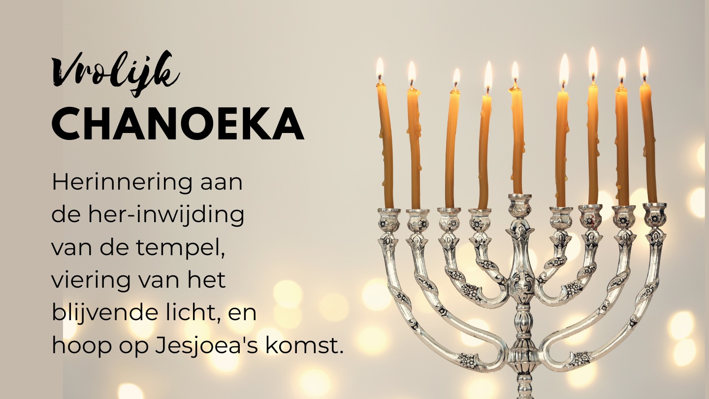 Chanoeka herinnert aan de her-inwijding van de tempel na de overwinning van de Makkabeeën. Acht dagen brandde de menora op